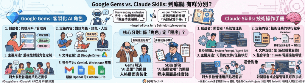 你有冇試過落咗一間餐廳,個侍應問你:「先生,你想要我哋嘅『專屬侍應服務』定係我哋廚房嘅『內部秘笈手冊』?」你呆咗一陣,答唔到話——因為你根本唔知道佢講緊咩分別。Google Gems 同 Claude Skills,就係呢種感覺。